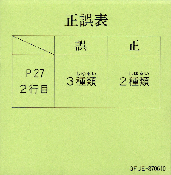 おまけ。サイズ比較のための一覧。正誤表は説明書やピンクの注意書きよりもやや小さいサイズ。
