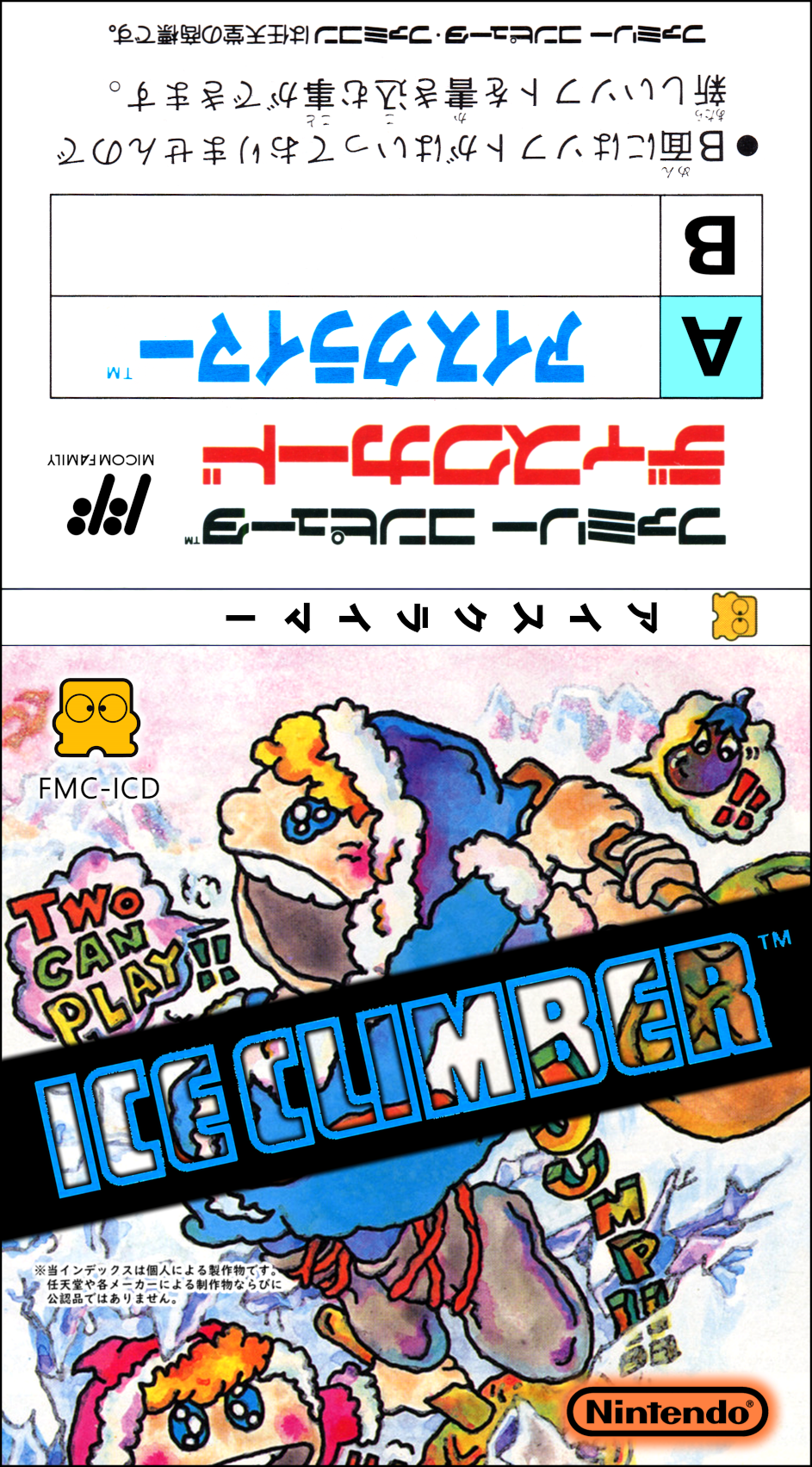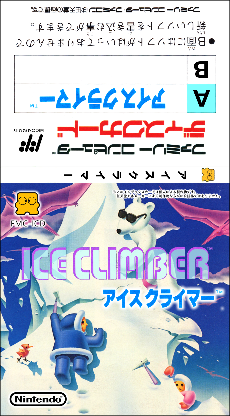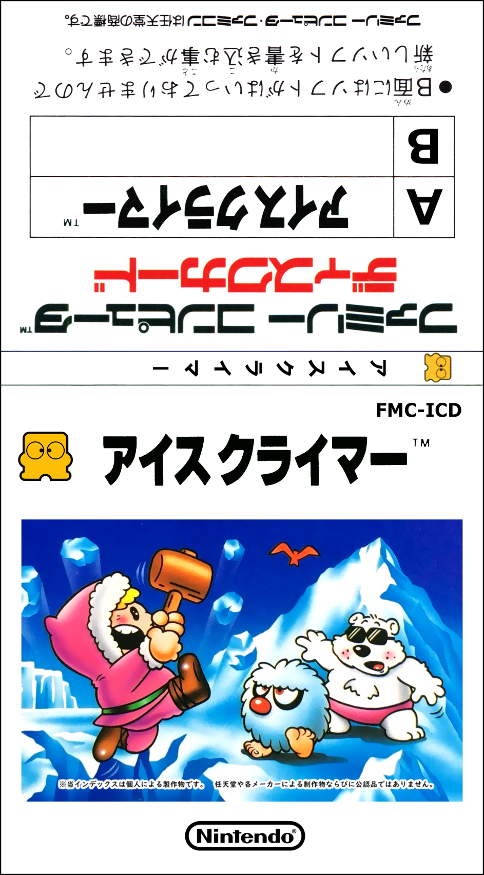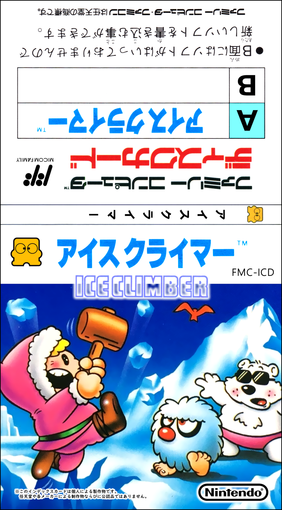 なおアイスクライマーのイラストはファミコン版ではなく、 ディスクシステム版の内容に合わせて 中央のオットセイを毛むくじゃらの雪男 (※) に変えています。 (※イラストはヨーロッパ版を使用しています。) | ![]() 参考までに、ファミコン版のラベル。真ん中のキャラはオットセイ。 |
